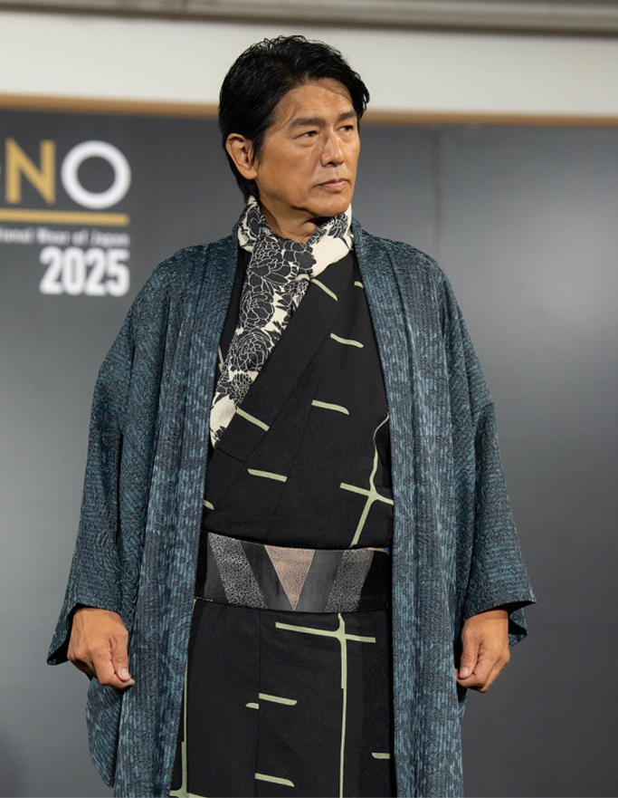 今回キモノイキモノからは、抜け感のある十字着物が選出され、高橋克典さんにご着用いただきました。細い格子の線は、実は下地の色。先に全体を染めてから、格子の線を残し、上からベースとなる色で染め上げます。その手間が掛けられた奥行きある色合いがさりげなく個性を引き立ててくれます。手染めならではの美しさと、今の気分に寄り添う配色、粋な着こなしでさらりと映える一枚です。このたびのご縁に深く感謝しつつ、これからも“美”を紡ぎ、届けてまいります。
