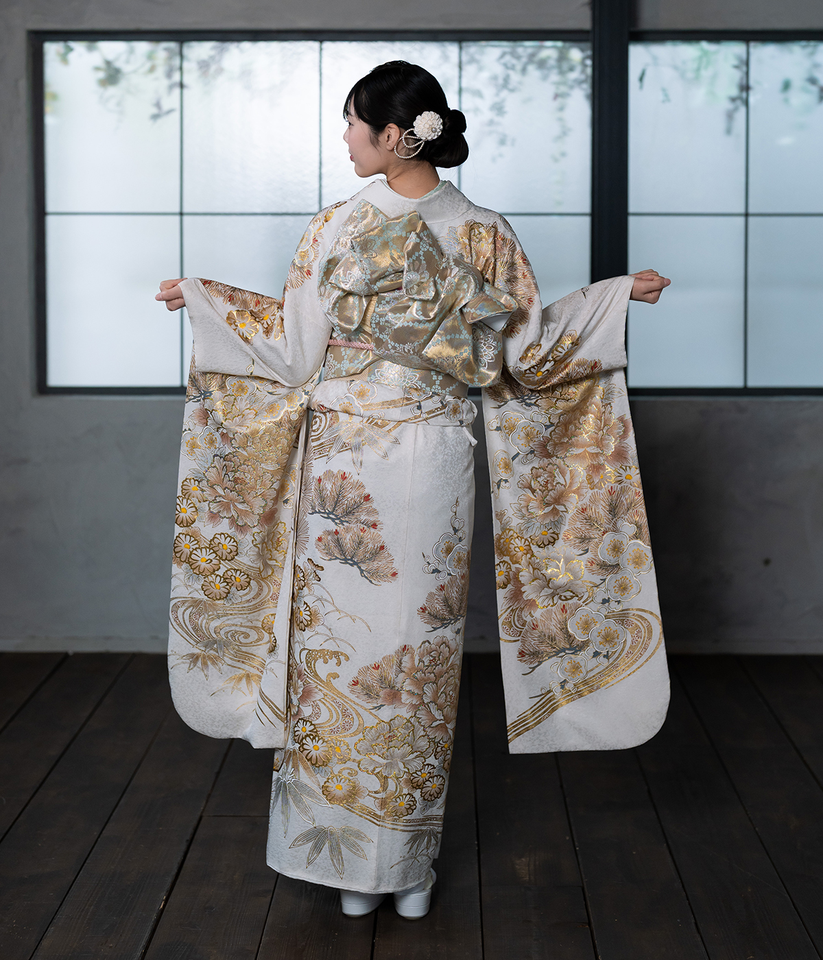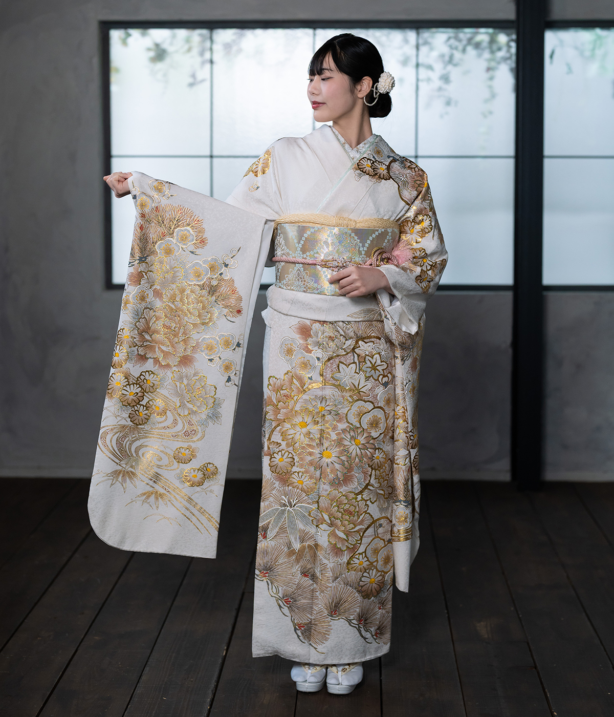 白金振袖は、金彩・銀彩友禅の技法を贅沢にあしらった、和凛の中でも最上級のシリーズです。 気品と華やかさを兼ね備え、まとうだけで周囲を魅了する存在感。人生の節目となる成人式や前撮り撮影、結婚式(親族)のお呼ばれにも最適です。手描き友禅の繊細さに、金銀の輝きが調和した一着は、まさに“本物”を求める大人の女性のための振袖。
