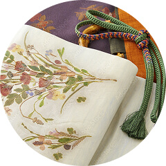 大切な方への贈り物や、旅の思い出の品として、西陣織の小物や額装などをご覧いただけます。帯という領域をこえ、屏風や障壁画、インテリア等西陣織あさぎの新たな可能性をお楽しみください。